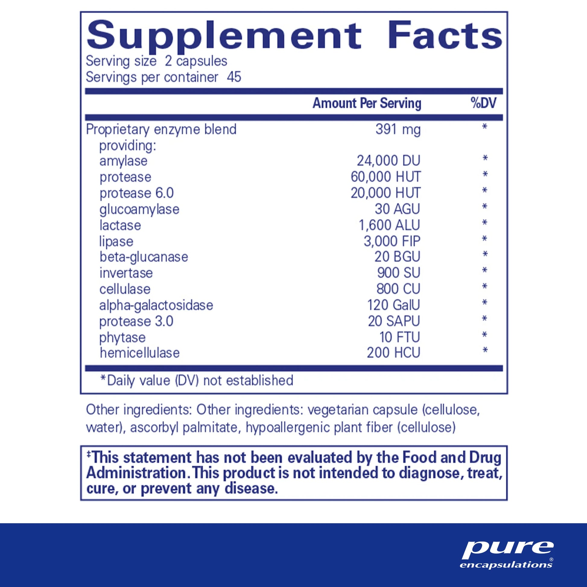 Pure Encapsulations Digestive Enzymes Ultra is a high-quality dietary supplement designed to support healthy digestion. This vegetarian-friendly formula features a comprehensive blend of digestive enzymes to support the breakdown of proteins, carbohydrates, fats, fibers, and dairy.